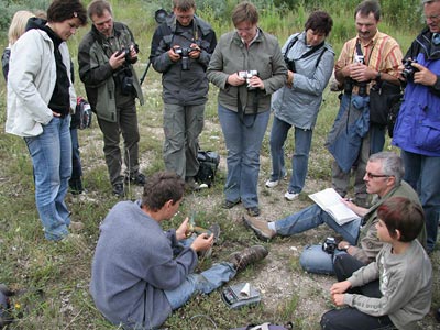 Gemeinsam mit Freunden vom NABU-Arbeitskreis Teichgebiet Dreba-Plothen führte der AKOOS am 19. Juli 2008 eine Exkursion in das Geiseltal durch, einem ehemaligen Tagebaugelände bei Mücheln in Sachsen-Anhalt. Nach 300 Jahren endete hier Mitte der 1990er Jahre der Braunkohletagebau. Im Rahmen der Rekultivierungsmaßnahmen hat die Flutung begonnen, wodurch nun aus dem Tagebaurestloch der Geiseltalsee entsteht. Ab dem Jahr 2010 wird er der größte künstliche See der Bundesrepublik Deutschland sein. Vorerst aber bietet die weiträumige Haldenlandschaft in einem Wechsel aus trockenen und feuchten Biotopen den Lebensraum für zahlreiche Offenlandbewohner. Unter den Insekten haben sich die Blauflüglige Ödlandschrecke (Oedipoda caerulescens) und die Blauflüglige Sandschrecke (Sphingonotus caerulans) angesiedelt. Die Wechselkröte (Bufo viridis) ist ein typischer Bewohner der Kleingewässer. Das Augenmerk der Vogelkundler aber galt dem farbenprächtigen Bienenfresser (Merops apiaster), der in den sandigen Steilhängen seit einigen Jahren in zunehmender Zahl brütet. Die Teilnehmer der Exkursion hatten die seltene Gelegenheit Martin Schulze bei der Beringung über die Schulter zu schauen und konnten die Bienenfresser so aus nächster Nähe betrachten. Der Fang der Altvögel erfolgt mit Stellnetzen vor den Bruthöhlen, die Nestlinge werden vorsichtig aus den meist bis 1,5 m langen Brutröhren entnommen.