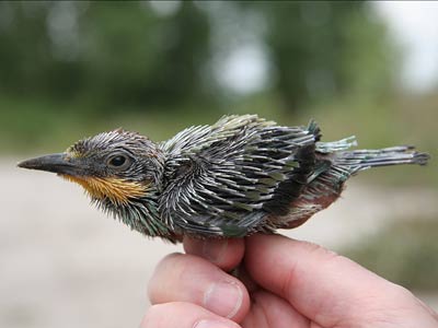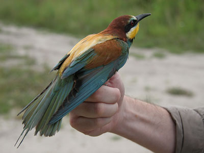 Schon auf dem etwa 6 km langen Fußmarsch zum Fangplatz war das markante trillernde "prürr" oder "krük krük" der jagenden Bienenfresser zu vernehmen. Die Vogelkundler aus dem Oberland erfreuten sich aber auch an Pirol (Oriolus oriolus) und Grauammer (Emberiza calandra). Auf den trockenen, vegetationsarmen Flächen konnten Heidelerchen (Lullula arborea) beobachtet werden. Brachpieper (Anthus campestris) wurden nicht bemerkt, doch ist die Art regelmäßiger Brutvogel in diesem Gelände. Typische Vertreter der Sukzessionsflächen waren Neuntöter (Lanius collurio) und Baumpieper (Anthus trivialis). Kormoran (Phalacrocorax carbo) und Haubentaucher (Podiceps cristatus) waren neben einem Paar Nilgänse (Alopochen aegyptiacus) und Graugänsen (Anser anser) am Geiseltalsee zu beobachten. In den Schilfbeständen sangen Teichrohrsänger (Acrocephalus scirpaceus). Interesse weckte auch eine Kolonie von Uferschwalben (Riparia riparia).