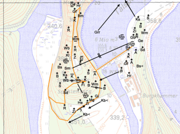 Nachdem die Frühjahrszusammenkunft des AKOOS die Rufe und Gesänge heimischer Singvögel als Schwerpunktthema behandelte, trafen sich am 17. April Interessierte zu einer ersten Vogelstimmenwanderung. Der Sophienberg bei Schloß Burgk war das Exkursionsgelände, das durch Strukturreichtum auf kleiner Fläche wertvolle Habitate bildet. Neben Saalestau- und -fließstrecken, Siedlungsbereichen einschließlich der Burganlage und den umliegenden Fichtenbeständen, sind es besonders die felsigen Hänge mit altem Eichen- und Lindenbestand, die eine bemerkenswerte Artenvielfalt schaffen. Trotz anfänglich nasser Witterung konnten insgesamt 34 Vogelarten nachgewiesen werden. Während der Wanderung wurden die Beobachtungen punktgenau auf einer Karte festgehalten (Abb.). Die damit gewonnenen Daten bieten nicht nur die Grundlage für wiederholte Kartierungen, sondern führten die Anwesenden in die Kartierungsarbeit ein. In kurzer Zeit und mit geringem Aufwand lassen sich repräsentative Daten gewinnen, die nicht nur für die Kenntnis der Regionalavifauna dienlich sind, sondern auch überregional Verwendung finden können. Eine zweite Vogelstimmenwanderung ist für den 20. Mai 2006 geplant.