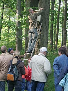 Wie in jedem Jahr führte der Heimat- und Kulturverein Schönbrunn e.V. eine Vogelstimmenwanderung in die nähere Umgebung des Ortes durch. Die Wanderung führte dieses Mal in den Ebersdorfer Park, der mit seiner 52 ha großen Fläche eine in der Region geradezu einzigartige Mannigfaltigkeit an unterschiedlichen Lebensräumen aufweist. Vogelarten des Siedlungsbereiches und der Laubwälder konnten ebenso beobachtet werden wie Arten, die Nadelwälder und Offenland bevorzugen. Die Wanderung begann 7.00 Uhr in Schönbrunn und endete 11.00 Uhr. Es herrschte trockenes, warmes und sonniges Wetter bei leichtem Wind. An einem jährlich besetzten Brutplatz des Waldkauzes (Strix aluco) wurde ein Nistkasten für diese Eule angebracht, der von einer Naturliebhaberin gespendet wurde. Unweit dieser Stelle konnte der Waldkauz sogar im Tageseinstand beobachtet werden. An anderer Stelle befestigten die Teilnehmer der Wanderung noch einen Höhlenbrüter- und einen Fledermauskasten. Ein weiterer Höhepunkt war sicher auch die Beringung von vier nestjungen Gebirgsstelzen (Motacilla cinerea). Insgesamt wurden 42 Arten nachgewiesen. Erfreulich war die Beobachtung mehrerer singender Trauerschnäpper (Ficedula hypoleuca). Dagegen konnte der Buntspecht (Dendrocopos major) überhaupt nicht beobachtet werden, obwohl 2005 7-8 Brutpaare anzutreffen waren. Die häufigsten Arten waren Star (Sturnus vulgaris), Buchfink (Fringilla coelebs) und Mönchsgrasmücke (Sylvia atricapilla).