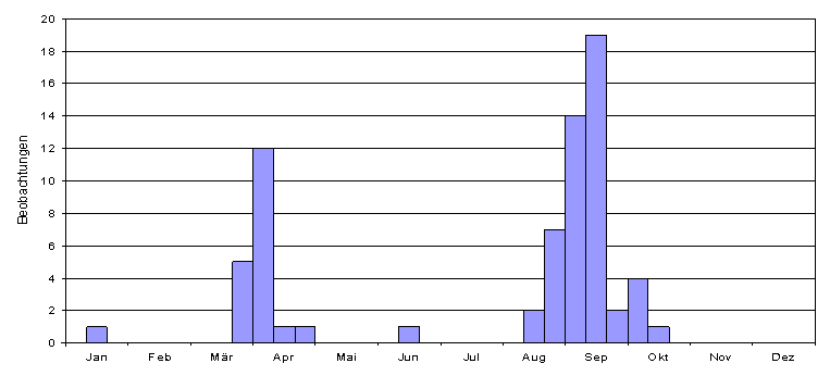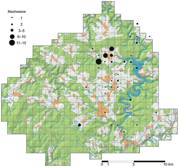 Die Mehrzahl aller Beobachtungen konzentriert sich im Oberlandplateau. Hier ist es insbesondere der Raum Remptendorf, in dem vergleichsweise viele Teiche liegen. Zu berücksichtigen ist, daß die Häufigkeit der Beobachtungen im nördlichen Beobachtungsgebiet entscheidend vom Aktivitätsmuster der Beobachter beeinflußt wird. Daher fehlen Beobachtungen aus anderen Gebieten weitgehend.