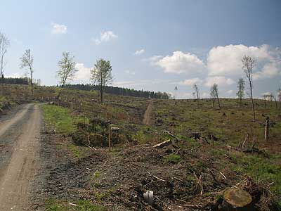 Der Orkan „Kyrill“, der am 18. Januar 2007 über Europa fegte, hinterließ allein in Thüringen 6300 ha Kahlflächen, 4700 ha gelichteten Wald und verstreute Baumwürfe auf 200.000 ha (1). Auch im Beobachtungsgebiet des AKOOS lichtete sich der Wald auf weiten Flächen. Ungeachtet des großen volks- und forstwirtschaftlichen Schadens bieten die entstandenen Blößen auch eine Chance für einen Neuanfang. Die in den vergangenen Jahren bereits begonnene Umgestaltung der Wälder von Fichtenmonokulturen hin zu abwechslungsreichen Mischwäldern erfährt gerade durch dieses Naturereignis eine umfassende Bestätigung. Auf den weitläufigen Kahlflächen sind oft genug nur einzelne Laubhölzer verblieben, die nun als Überhälter den Beginn einer neuen Waldsukzession markieren (Photo). War das vergangene Frühjahr durch intensive Räumarbeiten geprägt, so bietet sich dem Vogelkundler nun die Chance, die Dynamik der Avifauna auf solchen Katastrophenflächen zu verfolgen.