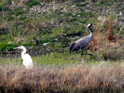 Kranich (Grus grus) und Silberreiher (Casmerodius albus) (Photo: R. Müller)Bei einem Beobachtungsgang am Speicher Herrenteich gelang Reinhard Müller am 20. April diese seltene Aufnahme: Kranich (Grus grus) und Silberreiher (Casmerodius albus) bei der Nahrungssuche. Während der Silberreiher in den vergangenen Jahren häufiger das Gebiet streift, dann aber eher an der Saale oder regelmäßiger noch im nahen Dreba-Plothener Teichgebiet angetroffen wird, beschränken sich die Nachweise des Kranichs fast ausschließlich auf überfliegende Formationen während der Zugzeit. Der hier gezeigte Vogel machte eine kurze Rast am Speicher. Das ist für das Beobachtungsgebiet ungewöhnlich.