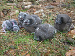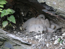(Photo: S. Kästner) In diesem Jahr haben die Turmfalken (Falco tinnunculus) im Gebiet der Oberen Saale ausgesprochen verschachtelt gebrütet. Nachdem im Vorjahr der Bestand einen spürbaren Einbruch erlitten hatte, waren nunmehr zahlreiche Brutplätze besetzt. Allerding schritten einige Paare sehr spät zur Brut, so daß zeitgleich zu ausgeflogenen Jungvögeln mehrere bebrütete Gelege festgestellt wurden. Das Bild zeigt Nestlinge einer Brut bei Lehesten.