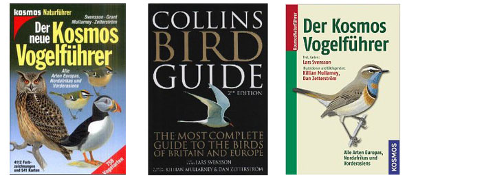 Erste deutsche Ausgabe (links), zweite englische Ausgabe (mitte) und zweite deutsche Ausgabe (rechts) des Bestimmungsbuchs.Das Angebot an vogelkundlicher Bestimmungsliteratur ist groß. Mittlerweile hat sich ein ergiebiger Markt entwickelt, auf den nahezu im Wochentakt neue Literatur geschwemmt wird. Für den Vogelkundler wäre die Suche nach einem geeigneten Feldführer eine echte Herausforderung, gäbe es nicht ein Referenzwerk, an dem sich nach meiner Auffassung alle anderen Werke messen lassen müssen. Schon lange habe ich das Buch "Der neue Kosmos Vogelführer" Interessierten empfohlen. Die Autoren Lars Svensson und Peter J. Grant swoie die Zeichner Killian Mullarney und Dan Zetterström haben es geschafft, ein Bestimmungsbuch an die Hand zu geben, das alle Wünsche an einen modernen Feldführer erfüllt: Es ist handlich, folgt einer Artsystematik, enthält alle Vogelarten in Europa einschließlich seltener Gäste und häufiger Gefangenschaftsflüchtlinge, beschreibt die Feldkennzeichen präzise und übersichtlich und besticht durch fabelhafte Zeichnungen, welche den Vogel in zahlreichen Kleidern und Posen zeigen. Die Abbildungen sind, wie man es erwarten darf, dem Text gegenübergestellt. Allein der Darstellungen wegen lohnt sich dieses Buch. Man nimmt es gern zur Hand, um die Details zu studieren und auch nach Jahren Neues zu entdecken.