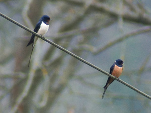 Rauchschwalbe mit rötlicher Unterseite neben einem in unseren Breiten normal gefärbten Individuum