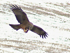 (Photo: S. Fiedler)Bei Frössen hat S. Fiedler am 23.3. 47 Mäsebussarde (Buteo buteo) zählen können. Das verschneite Feld, das nunmehr umgeackert wird, lockt auch andere Greifvögel an. Neben zwei Rotmilanen (Milvus milvus) war auch ein Schwarzmilan (Milvus migrans) zu sehen.