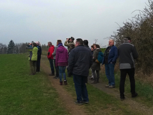 (Photo: M. Horn)Endlich – nach zweijähriger pandemiebedingter Pause - lud der AKOOS für den 23. April 2022 wieder zu einer Vogelstimmenwanderung ein. Bei eher kühler Witterung und wolkenbedecktem Himmel fanden sich 16 vogelkundlich Interessierte um 7.00 Uhr am Gräfenwarther Dorfteich ein. Unter der fachkundigen Führung von Sven Kästner waren die Exkursionsteilnehmer voller Erwartung, welche Vögel es zu hören und zu entdecken gibt. Schon am Startpunkt konnte ein Brutnachweis erbracht werden. Eine weibliche Stockente saß auf ihrem Gelege in dem eigens dafür errichteten Häuschen auf dem Teich. Es folgten weitere Beobachtungen im Siedlungsbereich von Bachstelze, Mehl- und Rauchschwalben, Gebirgsstelze, Amsel, Haussperling, Grünfink, Stieglitze, Stare und Hausrotschwanz. Ebenso konnte der Balzflug einer Ringeltaube sowie der Überflug von drei Nilgänsen beobachtet werden. Entlang an teils nicht mehr bewirtschafteten Gärten, die aber einen wichtigen Beitrag zum Artenschutz darstellen, vernahmen wir dann die Gesänge von Rotkehlchen, Mönchsgrasmücke und Zilpzalp, sahen einen Paarungsversuch eines Blaumeisenpaares und den Revierkampf von zwei männlichen Goldammern. Von den Agrarflächen konnten wir die Gesänge zweier Feldlerchen hören und einen von den Schafwiesen auffliegenden Graureiher sehen. Auf der 20-kV-Leitung zählten wir elf rastende Ringeltauben, die höchste Anzahl einer Art an diesem Tag. Bei den Feldgehölzen im Geräumte machte uns Sven auf einen Baumpieper aufmerksam. Es war eine der ersten Beobachtungen für unsere Region in diesem Jahr. Die Sichtung von Greifvögeln blieb unter den Erwartungen. Vom Turmfalken, Sperber, Mäusebussard und Rotmilan konnten wir je nur ein Individuum erblicken. Auch die Anzahl der singenden Singdrosseln und Buchfinken war gering. An der Waldkante des Bühls angekommen, waren die Rufe von Schwarz- und Grauspecht zu vernehmen. Sven Kästner erklärte uns sehr anschaulich anhand von Abbildungen und Rufaufzeichnungen auf seinem Tablet den Unterschied zwischen Grau- und Grünspecht. Lange mussten wir an diesem Tag auf die Beobachtung eines Zaunkönigs warten. Weitere Nachweise am Waldrand und in der Heckenstruktur gelangen uns bei Tannenmeise, Gimpel, Heckenbraunelle, Kernbeißer, Fitis, Kleiber, Weidenmeise und Hohltaube. Mit der Beobachtung einer überfliegenden Wiesenschafsstelze - der erste Nachweis in diesem Jahr - hatten wir alle drei bei uns vorkommenden Stelzenarten gesehen. Auch hier konnte Sven die besonderen Merkmale der unterschiedlichen Arten am Tablet einprägsam vermitteln. Wieder am Gartengürtel angekommen, war der inzwischen recht selten gewordene Gartenrotschwanz zu beobachten. Auch den Nachweis von Bluthänflingen und eines singenden Girlitzes konnten wir erbringen. Außerdem waren mehrere Trupps ziehender Finken zu sehen, die durch ungünstige Lichtverhältnisse nicht näher bestimmt werden konnten. Trotz geeigneten Habitats waren weder Baumläufer noch Sommer- oder Wintergoldhähnchen an diesem Morgen zu beobachten. Am Ende der Wanderung zählten wir dennoch Nachweise von 50 verschiedene Vogelarten. Die Teilnehmer an der Exkursion waren sich einig, dass die Vogelstimmenwanderung mit Sven Kästner, der über ein enormes ornithologisches Fachwissen verfügt, jedes Mal aufs Neue spannend, lehrreich und ein Naturerlebnis der besonderen Art ist.